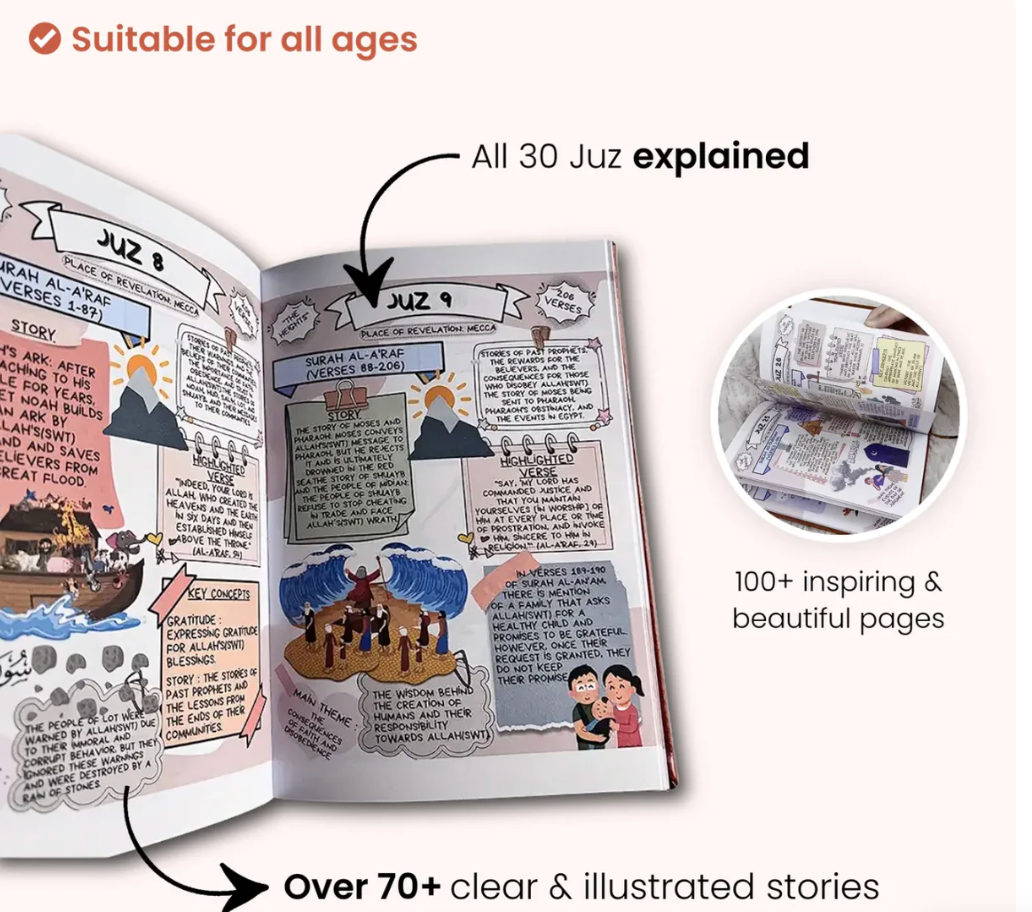 So grateful for this kids edition. This is perfect for elementary kids, and converted muslims, who could benefit from some visuals, to understand the meanings of the early learned Surahs. My kids love it and we use it every night while we recite at bedtime. I highly encourage this if you have kids and want to instill the love of our deen.